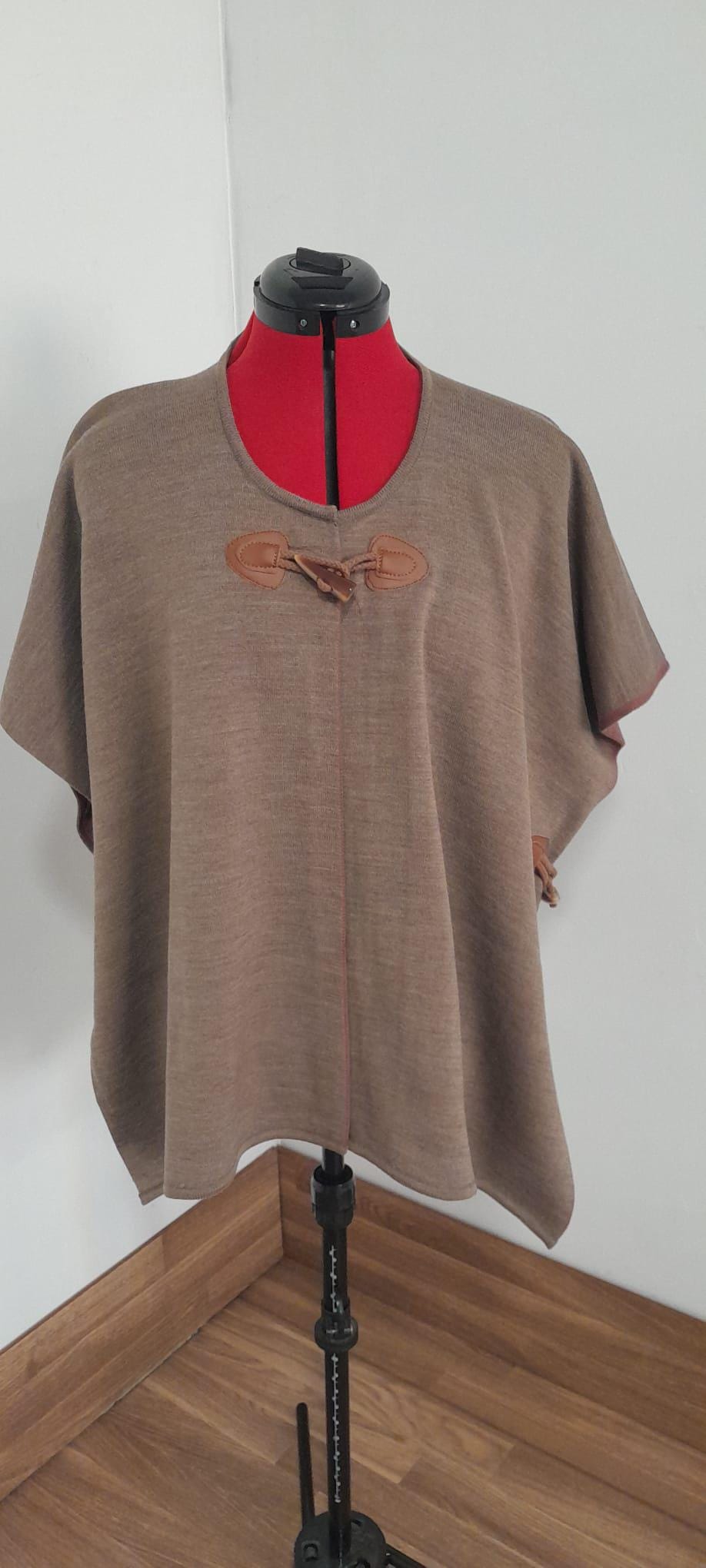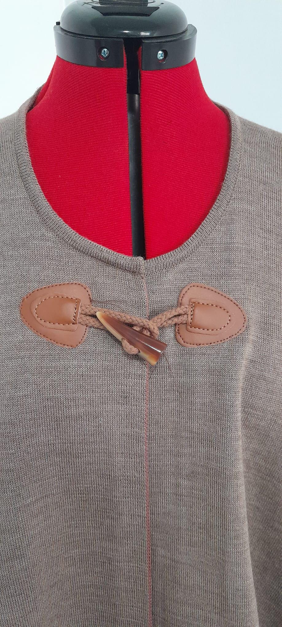 Looking for that piece that makes you feel warm and stylish? This soft and comfortable layer is the answer. Knitted with wonderful merino wool, it's incredibly warm yet surprisingly light. Its neutral color goes with everything, and the loose, flowing cut flatters any figure. Check out the rustic leather closure detail: it's the perfect touch that makes it unique. Simply layer it over a sweater or dress and you're ready to go. A handcrafted piece you'll want to wear every day!