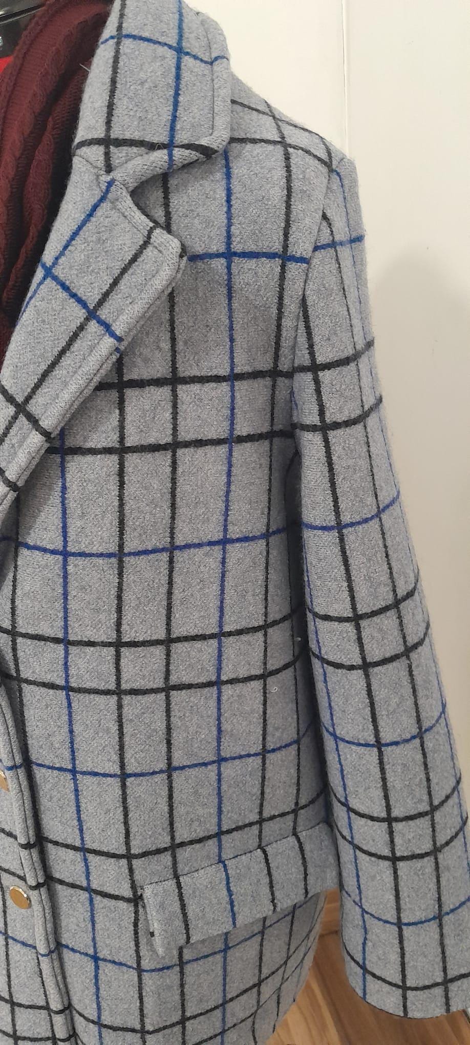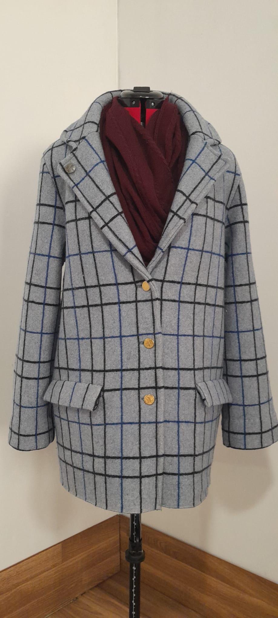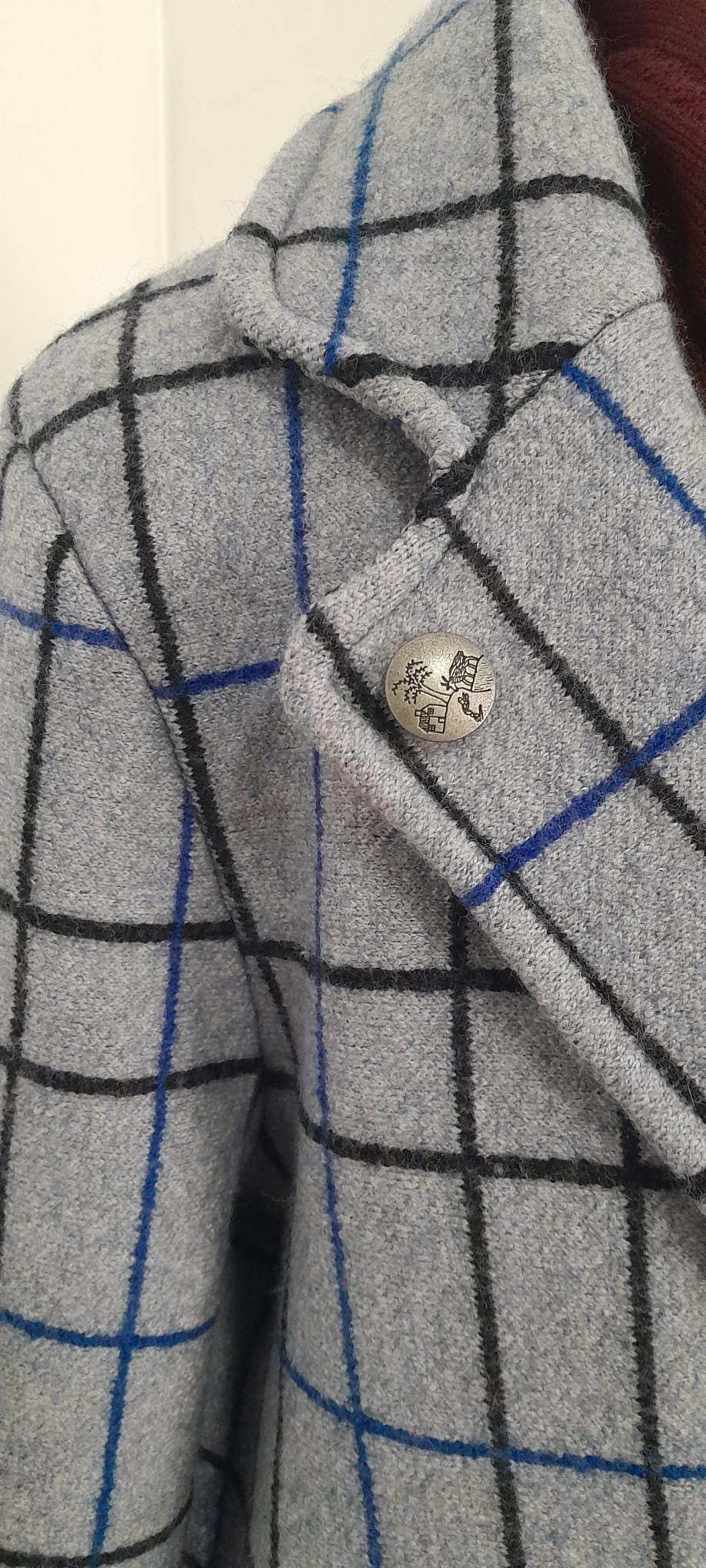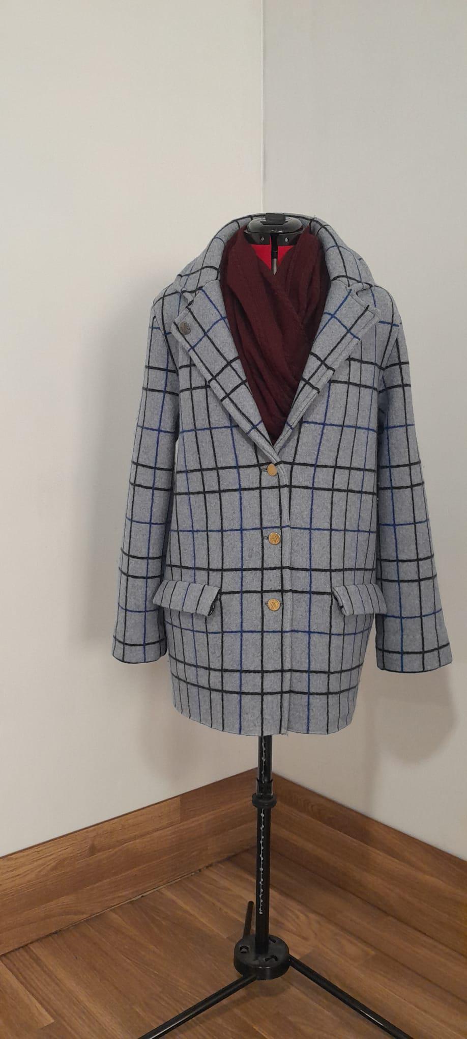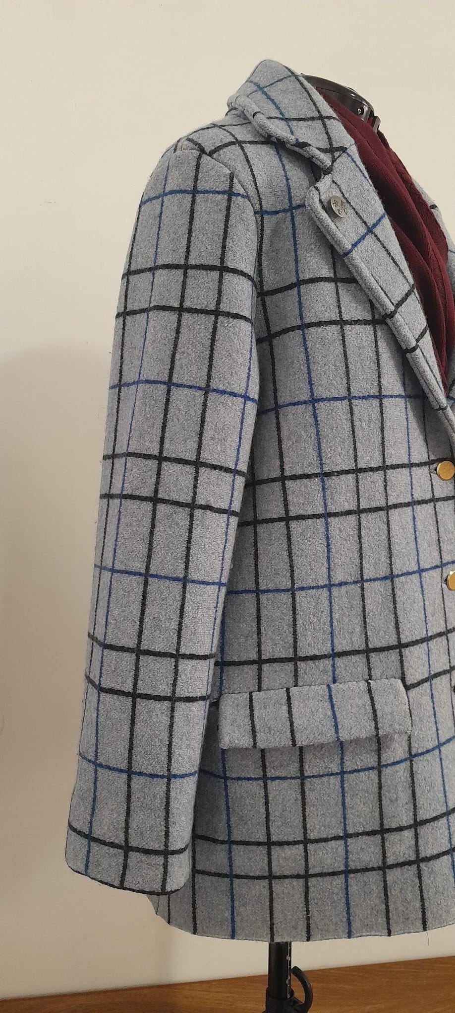It features a timeless grid pattern in neutral tones (grey, charcoal, and blue), making it the most versatile piece in your wardrobe: perfect for a professional look over a suit or to elevate a casual weekend outfit.
