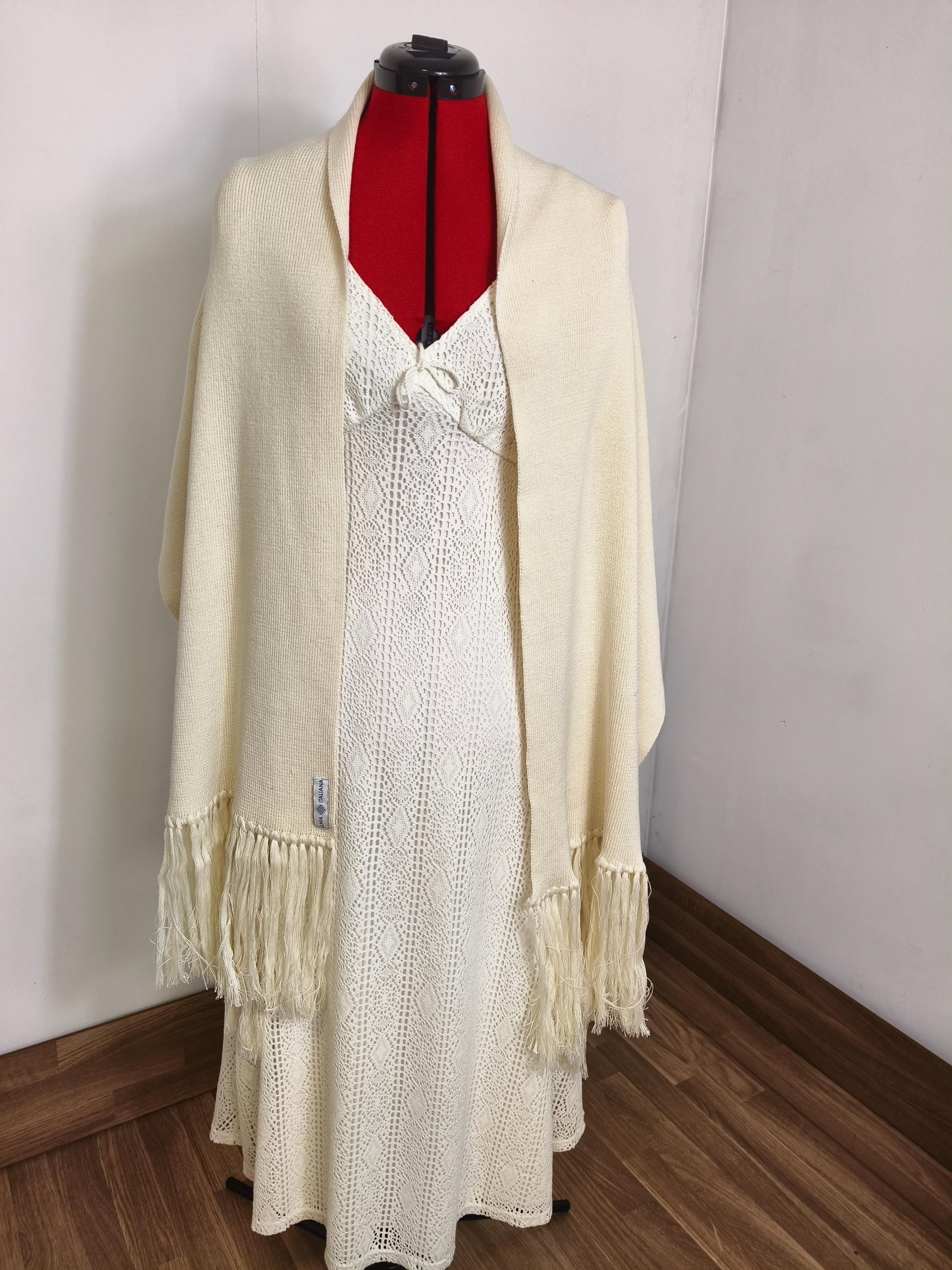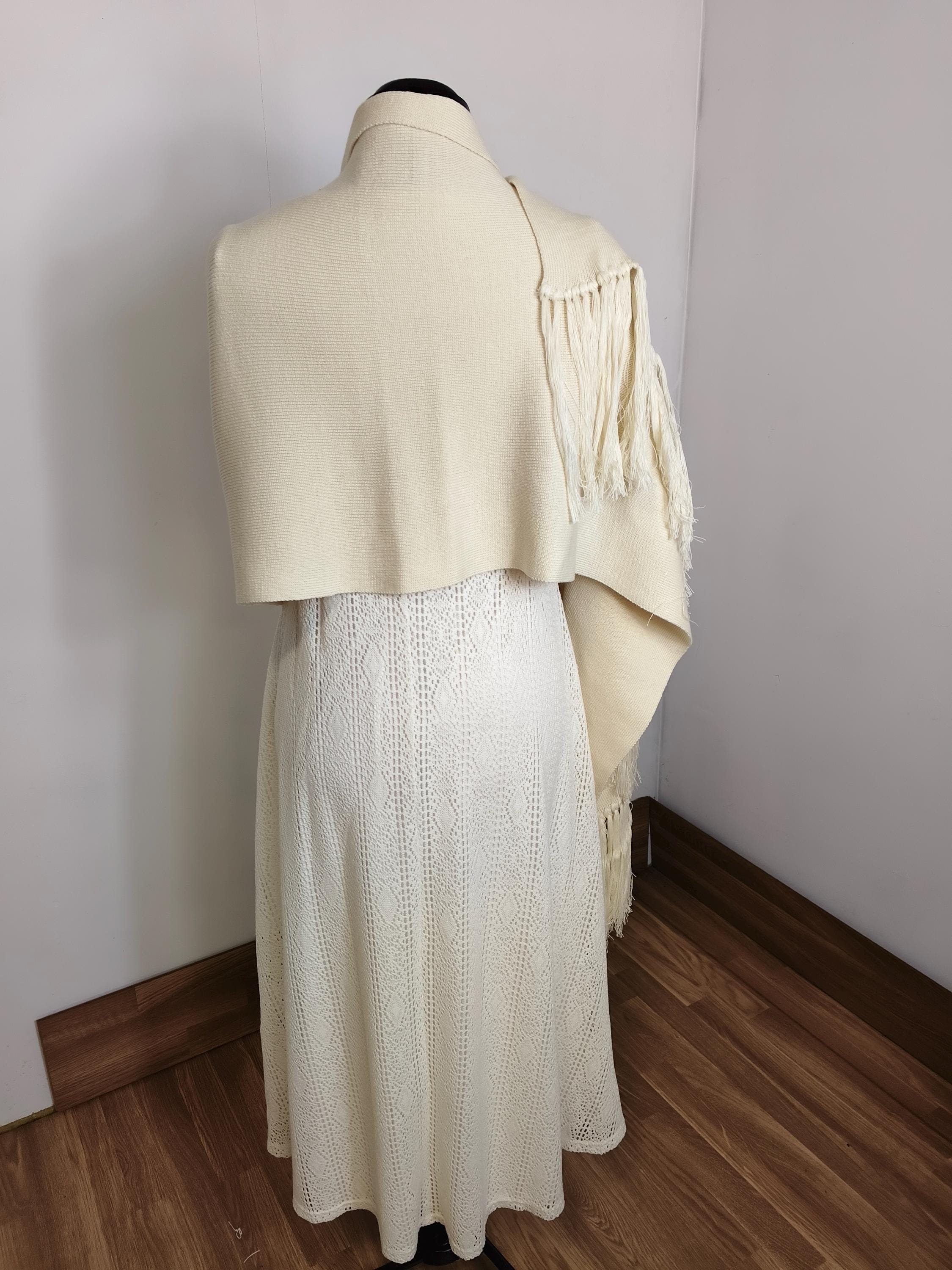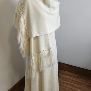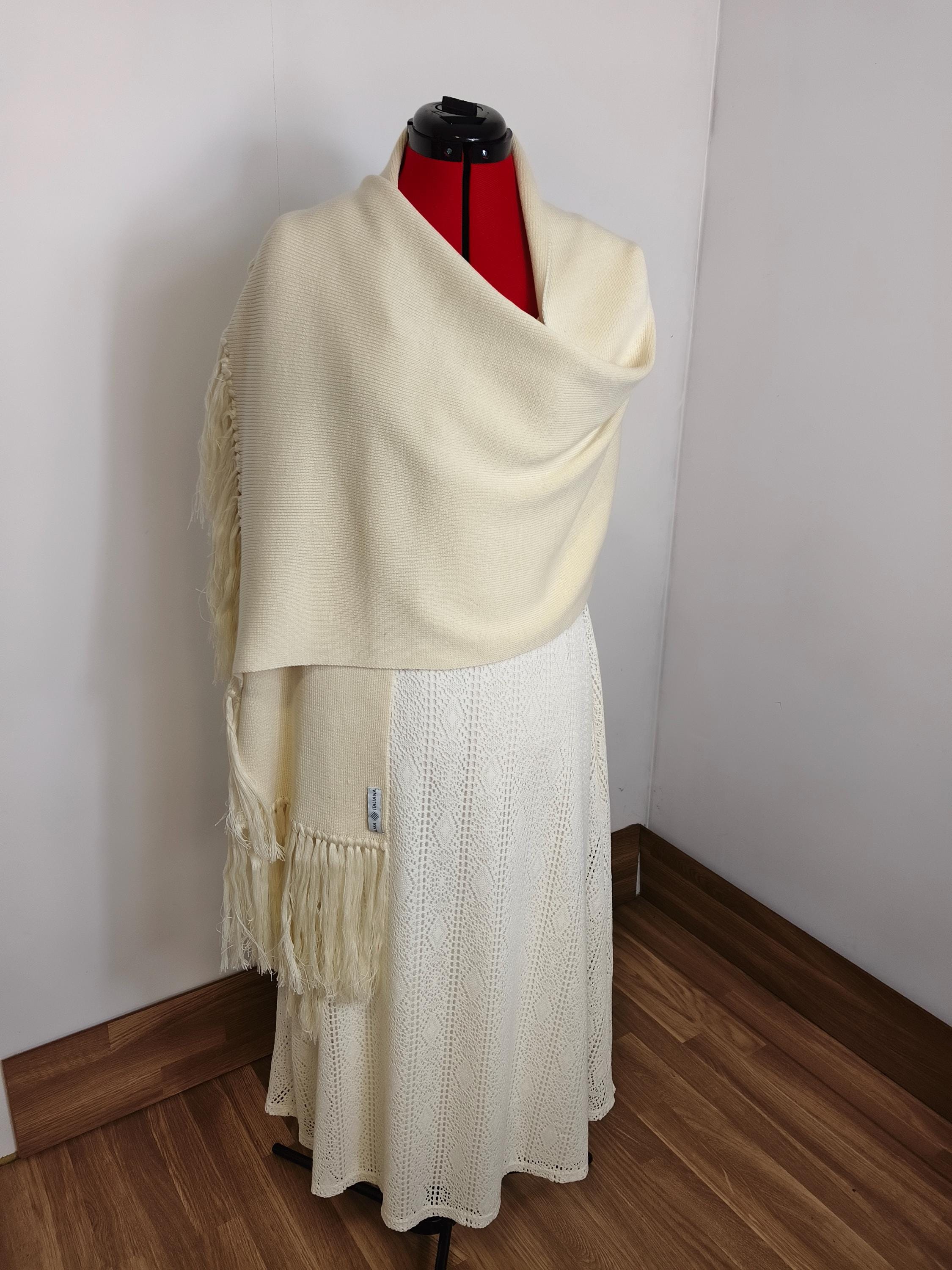 Complete your bridal look with this exclusive piece from our collection: a pashmina woven entirely from cotton and silk, designed to envelop the bride in a caress of softness and light. Its ivory white hue is the perfect complement to any dress style, adding a layer of warmth ideal for outdoor ceremonies, churches, or the evening breeze.