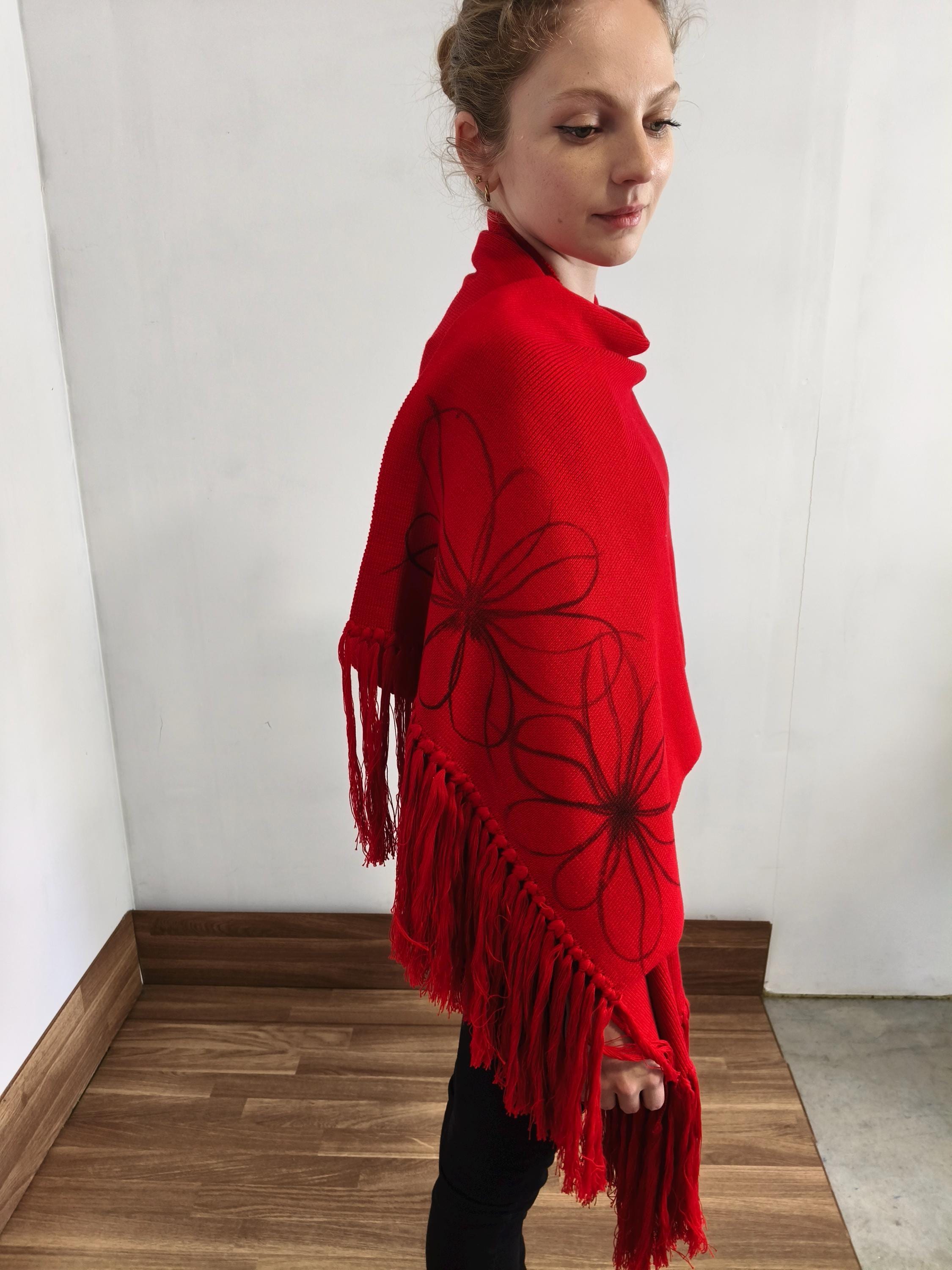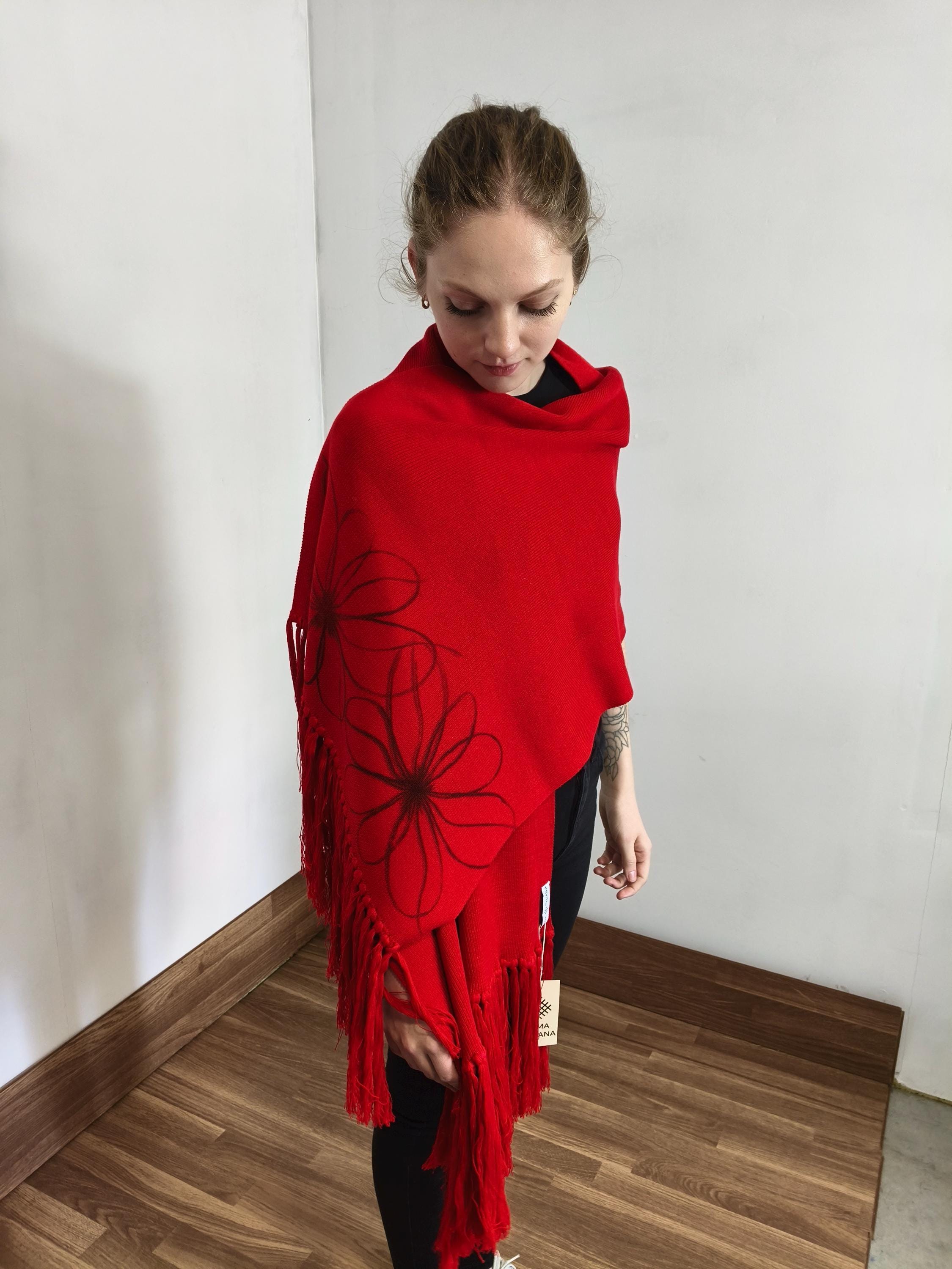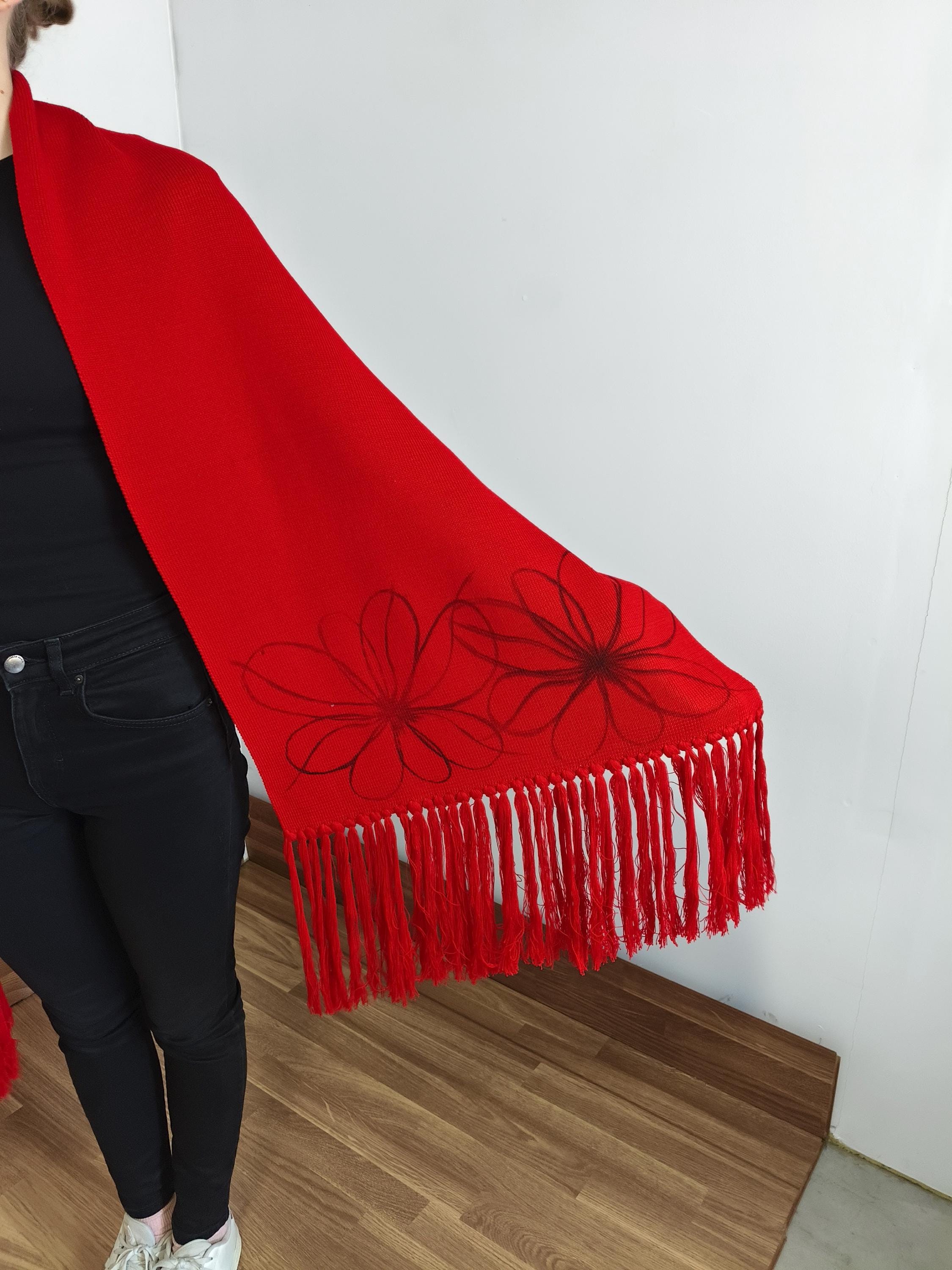 Each pashmina is a unique work of art. What truly makes it special is its vibrant, fiery red color, enhanced with a hand-drawn floral pattern. It's not a mass-produced accessory; it's a collector's item. It's low fashion at its finest. Contemporary bohemian style.
