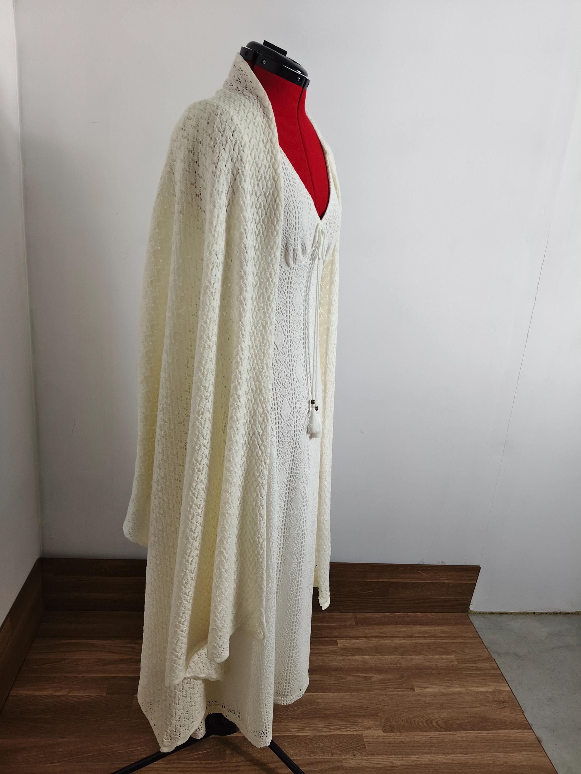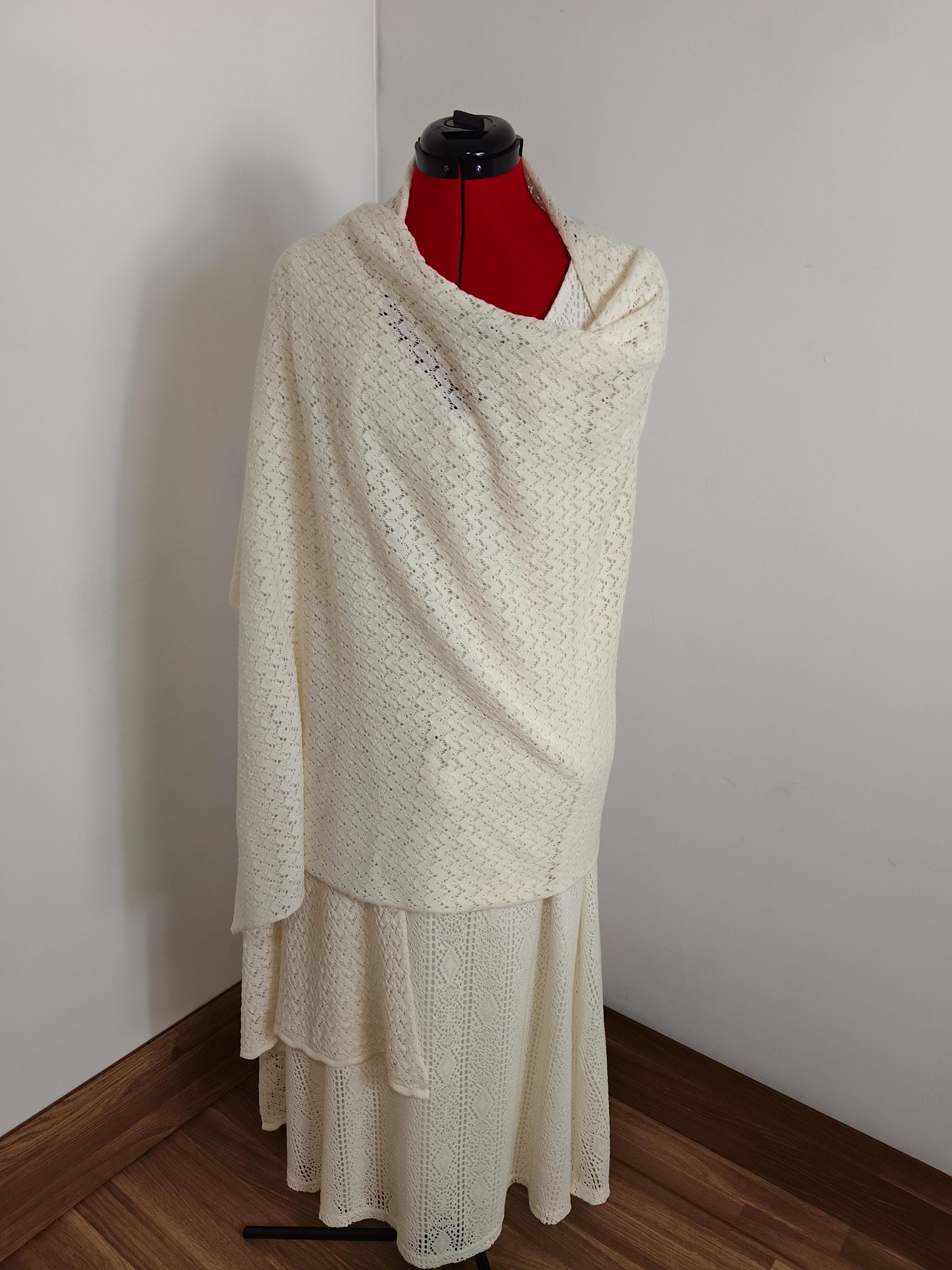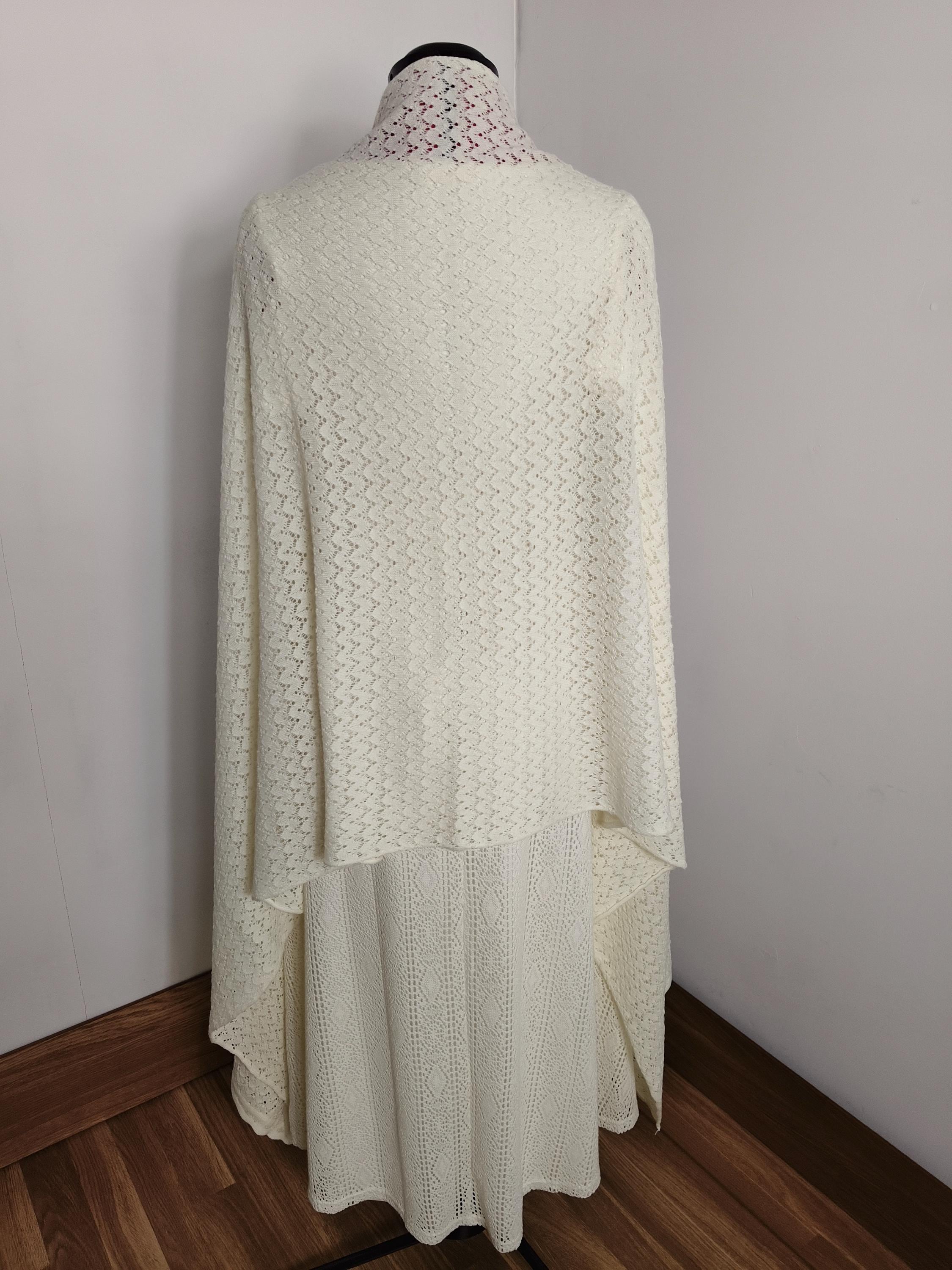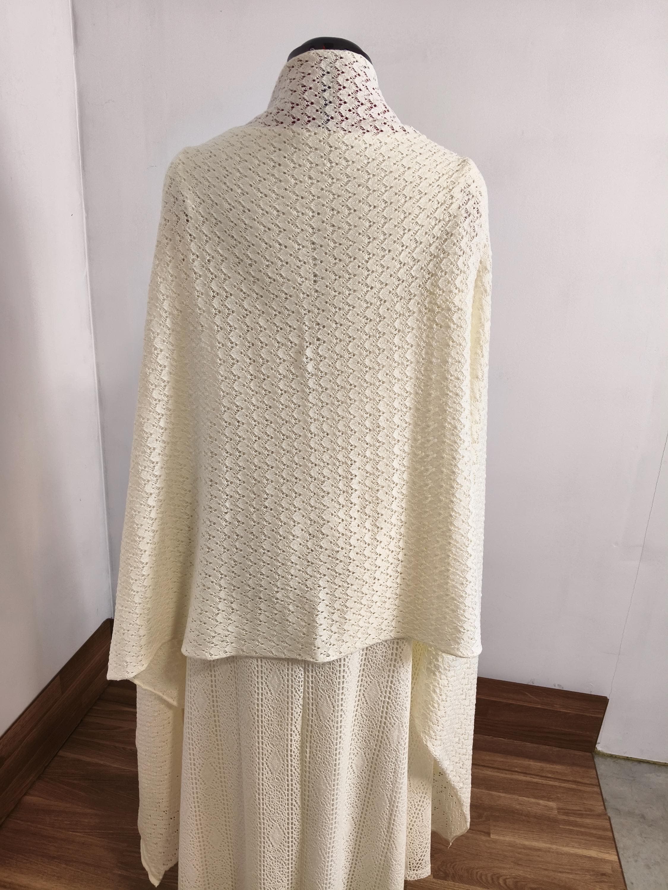 Envelop yourself in pure delicacy with our extra-fine Merino wool shawl, lovingly and meticulously woven. This piece is a celebration of femininity and craftsmanship. Its intricate openwork pattern creates an ethereal and lightweight texture that drapes softly over the shoulders, adding a touch of bohemian sophistication to any outfit. This shawl is a versatile piece suitable for a variety of occasions. Perfect as a unique and alternative bridal veil for a boho-style wedding. Length 220cm Width 70cm