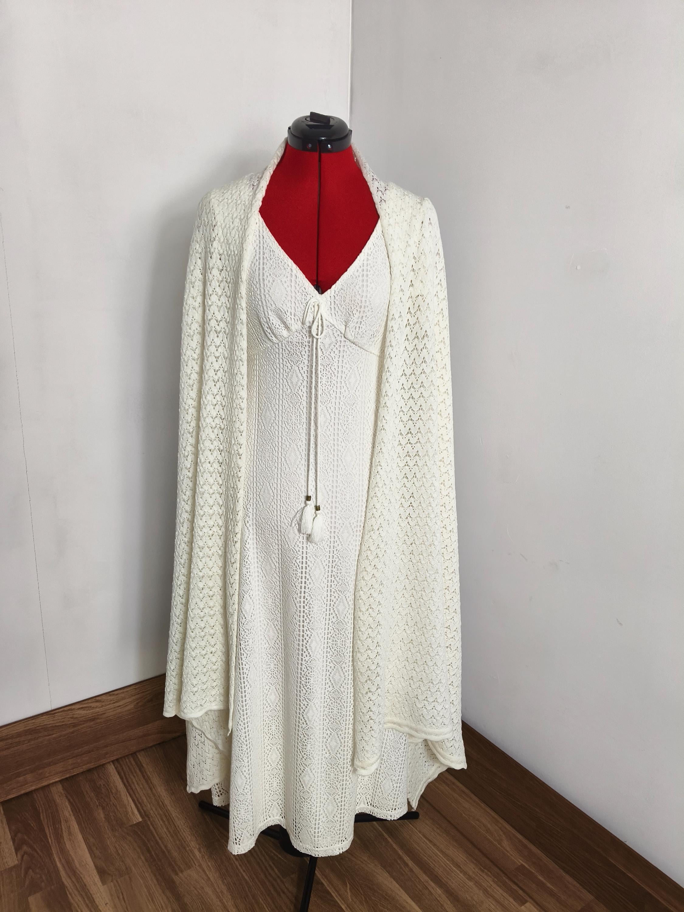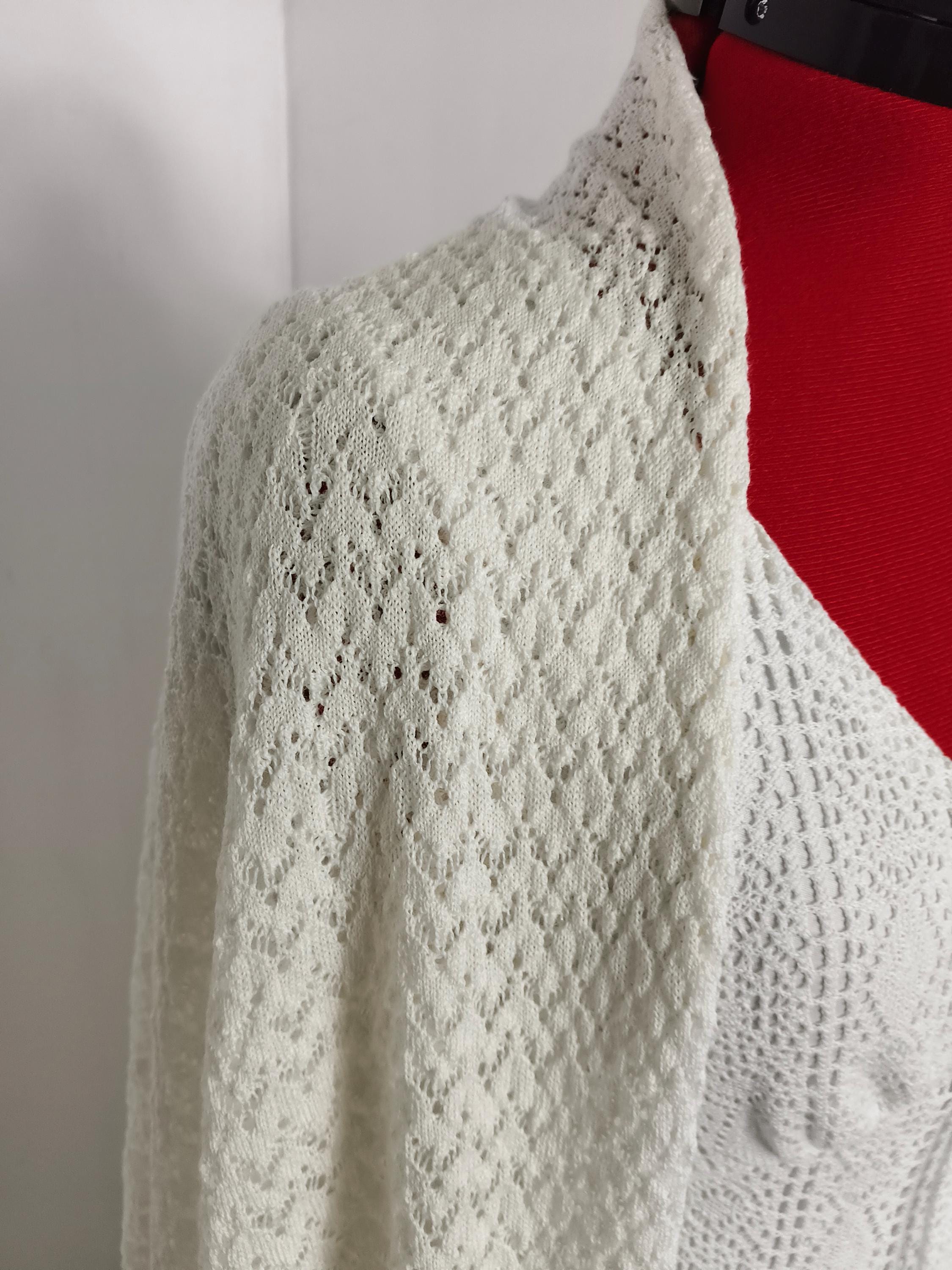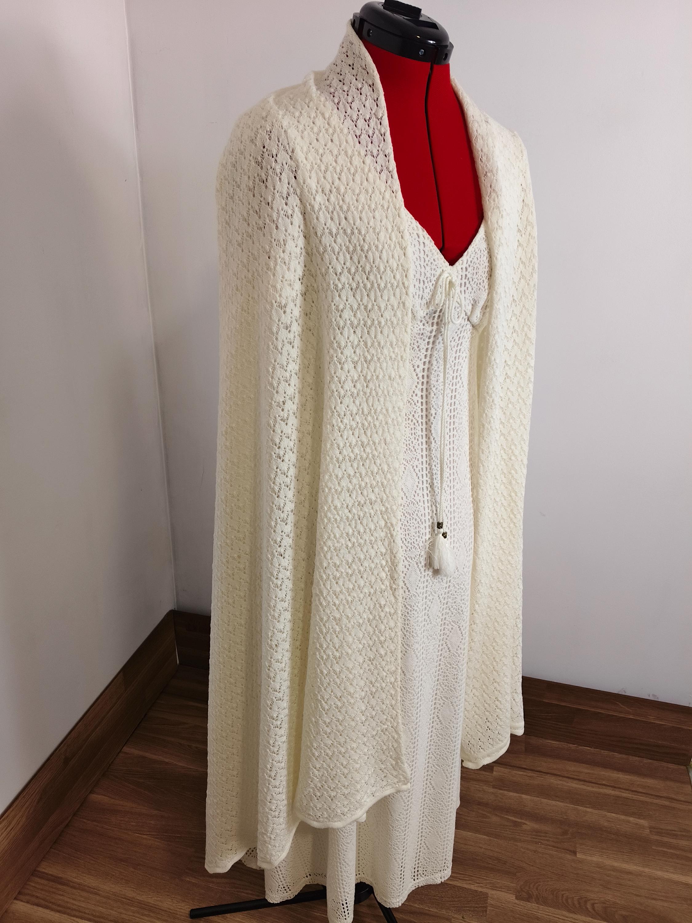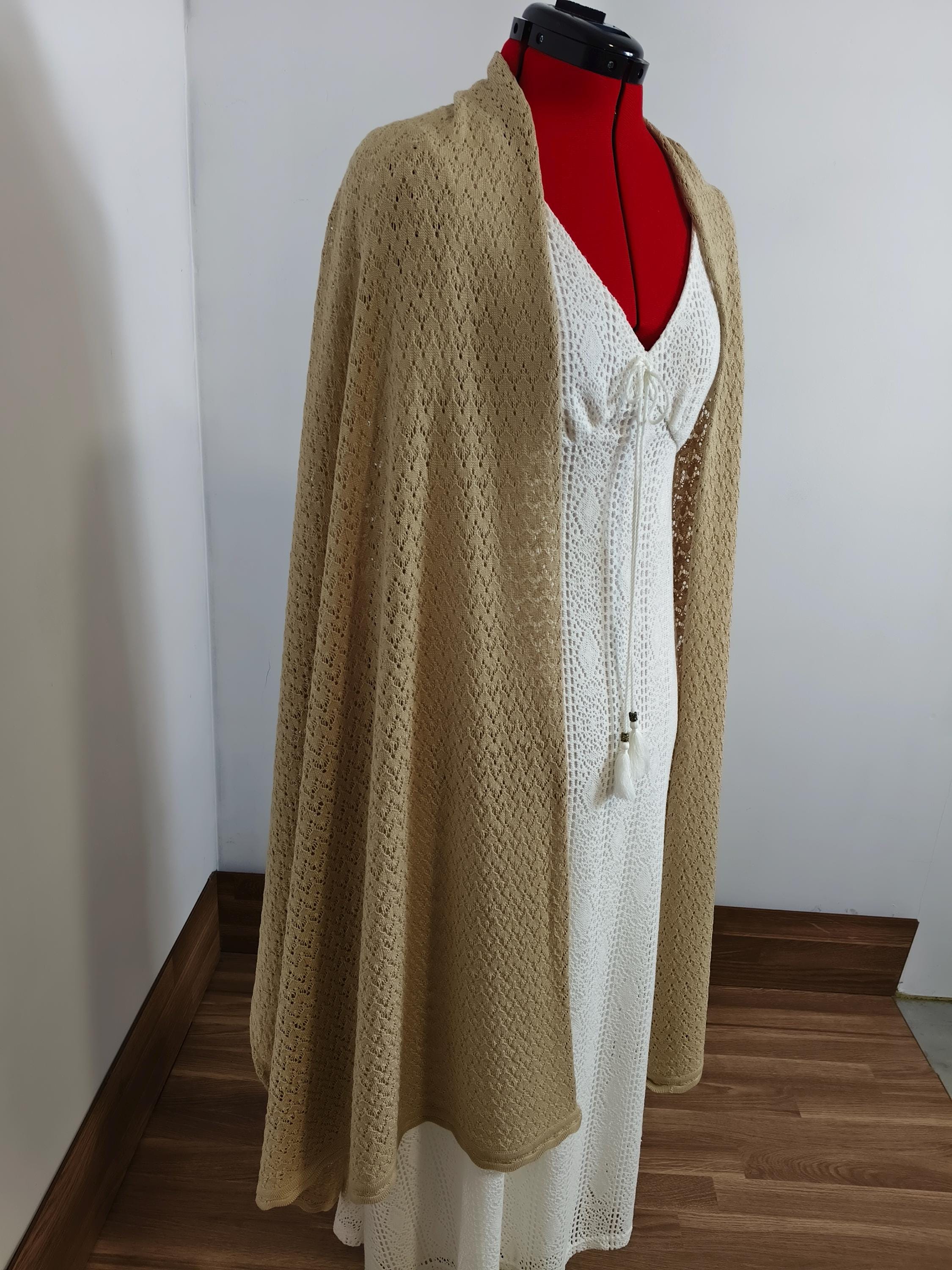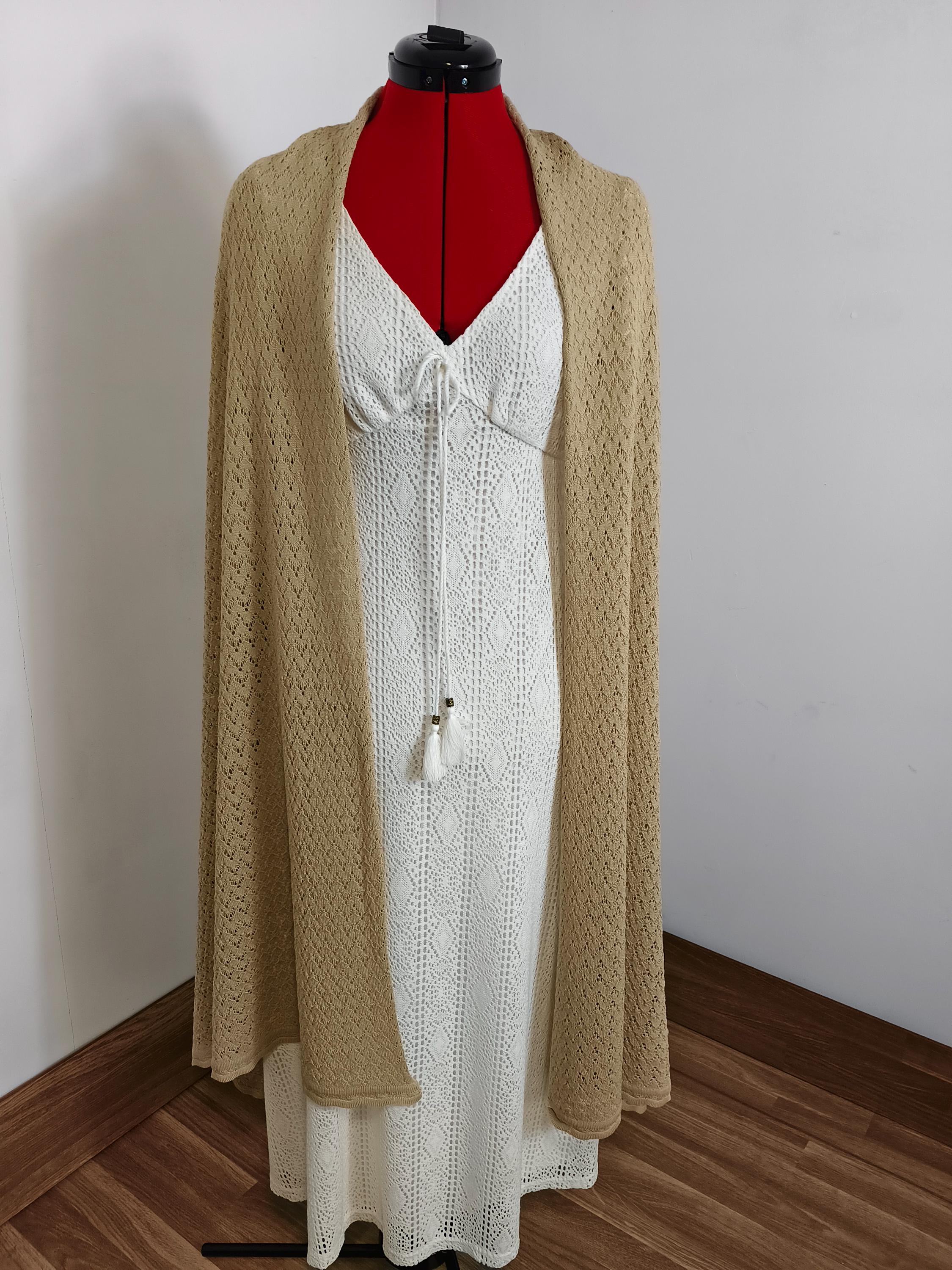 Envelop yourself in pure delicacy with our extra-fine Merino wool shawl, lovingly and meticulously woven. This piece is a celebration of femininity and craftsmanship. Its intricate openwork pattern creates an ethereal and lightweight texture that drapes softly over the shoulders, adding a touch of bohemian sophistication to any outfit. This shawl is a versatile piece suitable for a variety of occasions. Perfect as a unique and alternative bridal veil for a boho-style wedding. Length 220cm Width 70cm